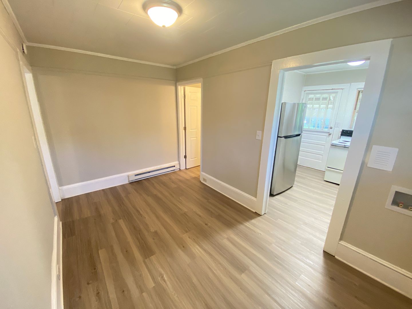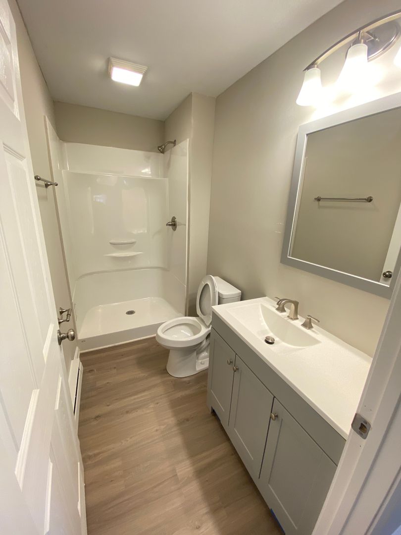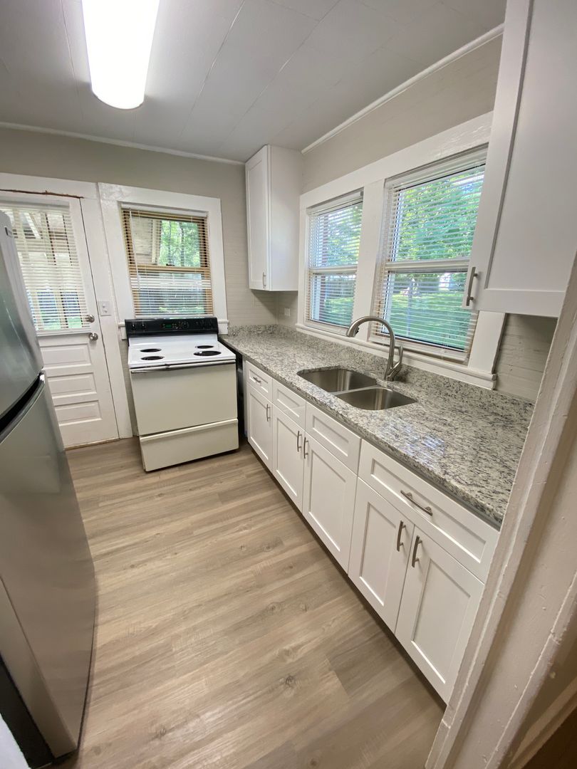 1 bed 1 bath Duplex with 2 entrances (1 into the den & 2nd into the kitchen), separate driveway/parking from the other unit, The renovation in 2023 included a new kitchen, new bathroom, repainting, new flooring, and new fixtures. The bedroom is off the den with plenty of light, other features include a washer/dryer hookup, includes refrigerator and stove, all-electric unit with baseboard heat, 2 window AC units, and a spare room that has the washer/dryer hookups.